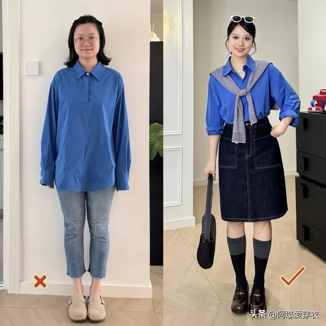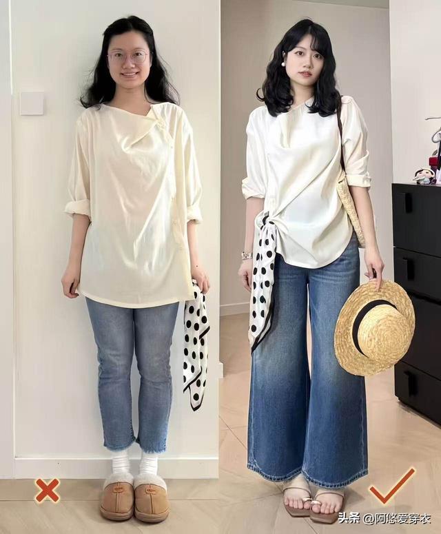 比如穿宽松的衣服时,我们可以把衣摆塞进下装的腰间,把腰线提起来,穿鞋子的时候选轻便带跟的款式,别总是随便踩上平底鞋就出门,才能很好地优化我们的身材比例,避免穿出累赘笨拙感。